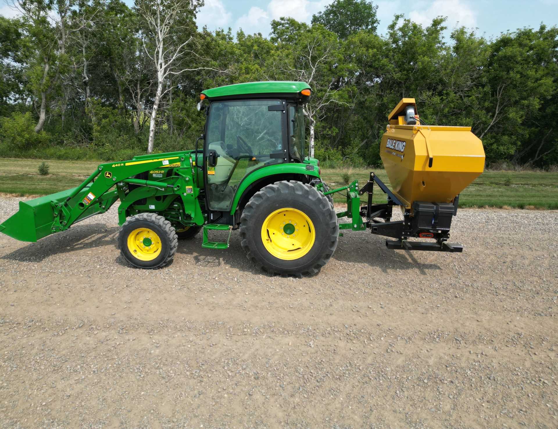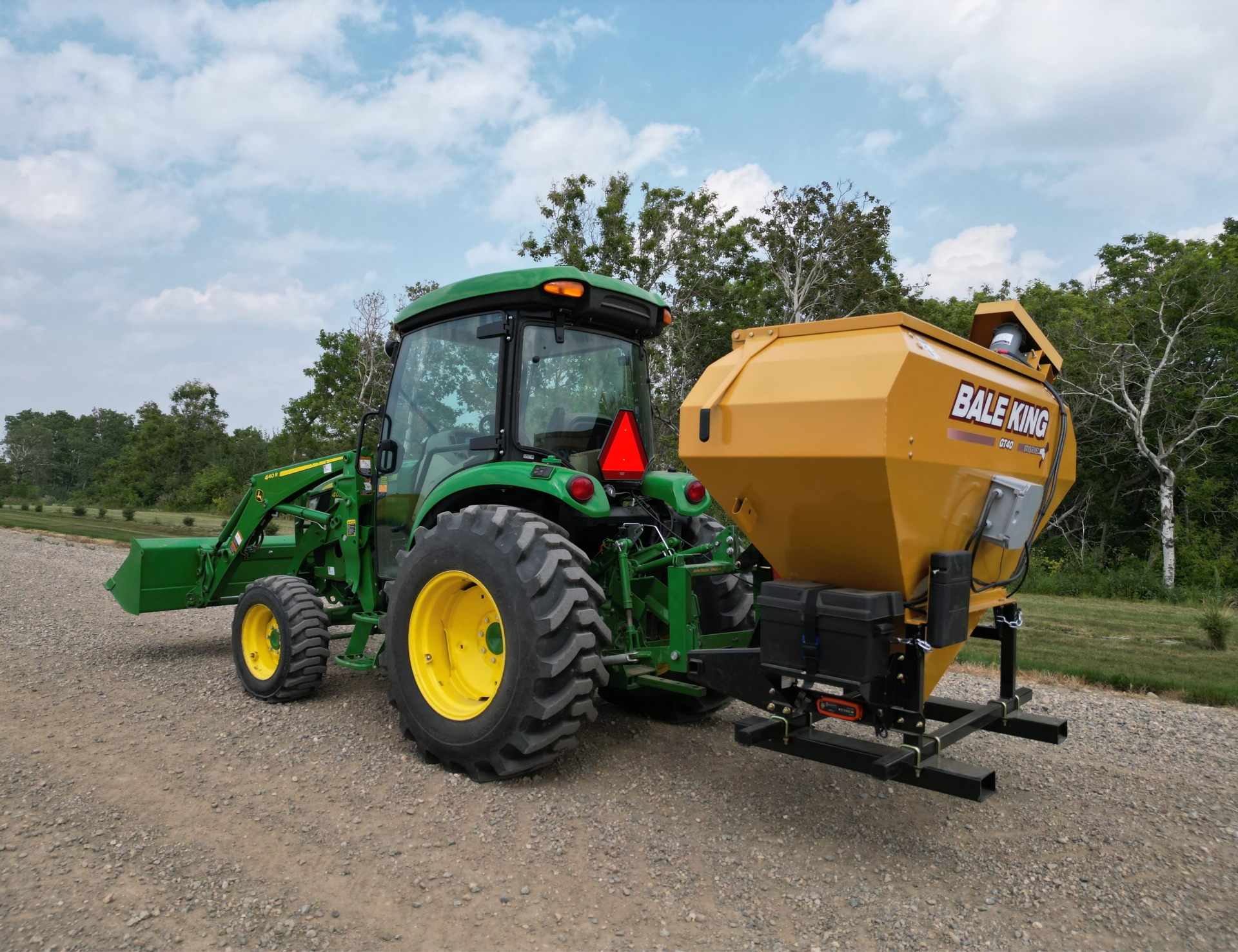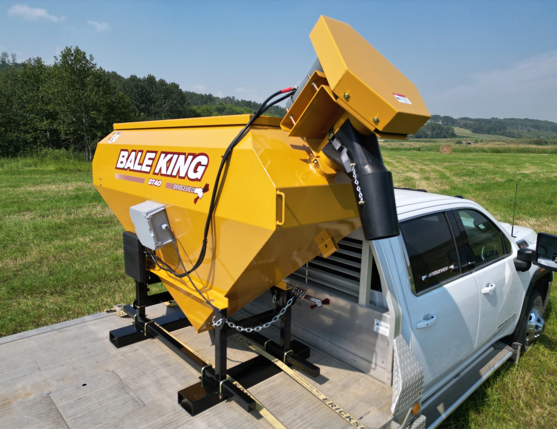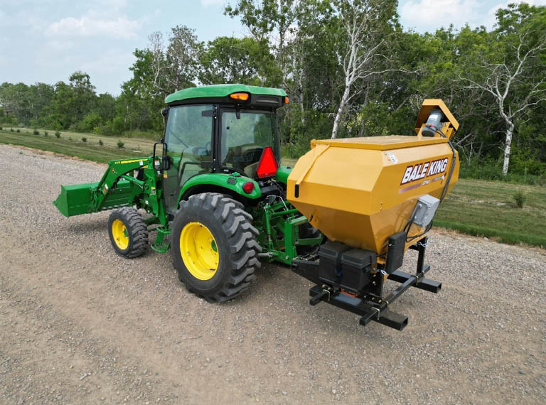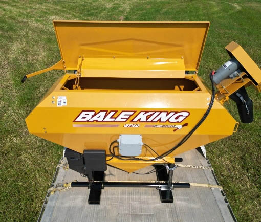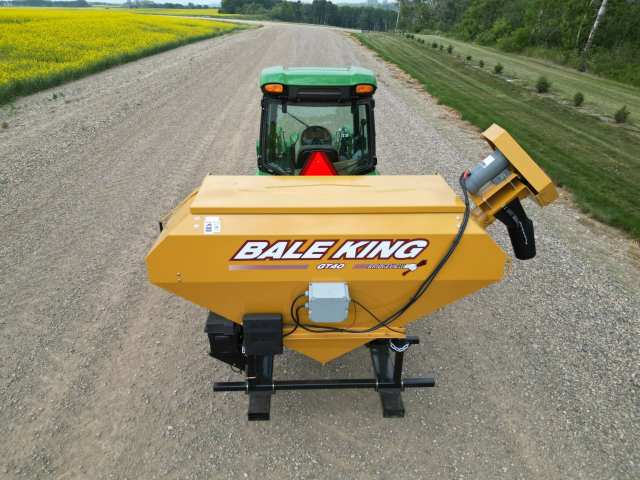 The GT40 is simple, effective, and built for versatility. Adjustable fork pockets allow compatibility with a range of power units, while the hydraulic auger drive ensures dependable performance in all weather conditions. It comes equipped with 8-foot hoses and requires only one tractor remote, making it easy to integrate into your operation. It’s an ideal option if you want to bring the processor along—lay down a windrow, then turn around and top-dress it in a single, efficient pass.